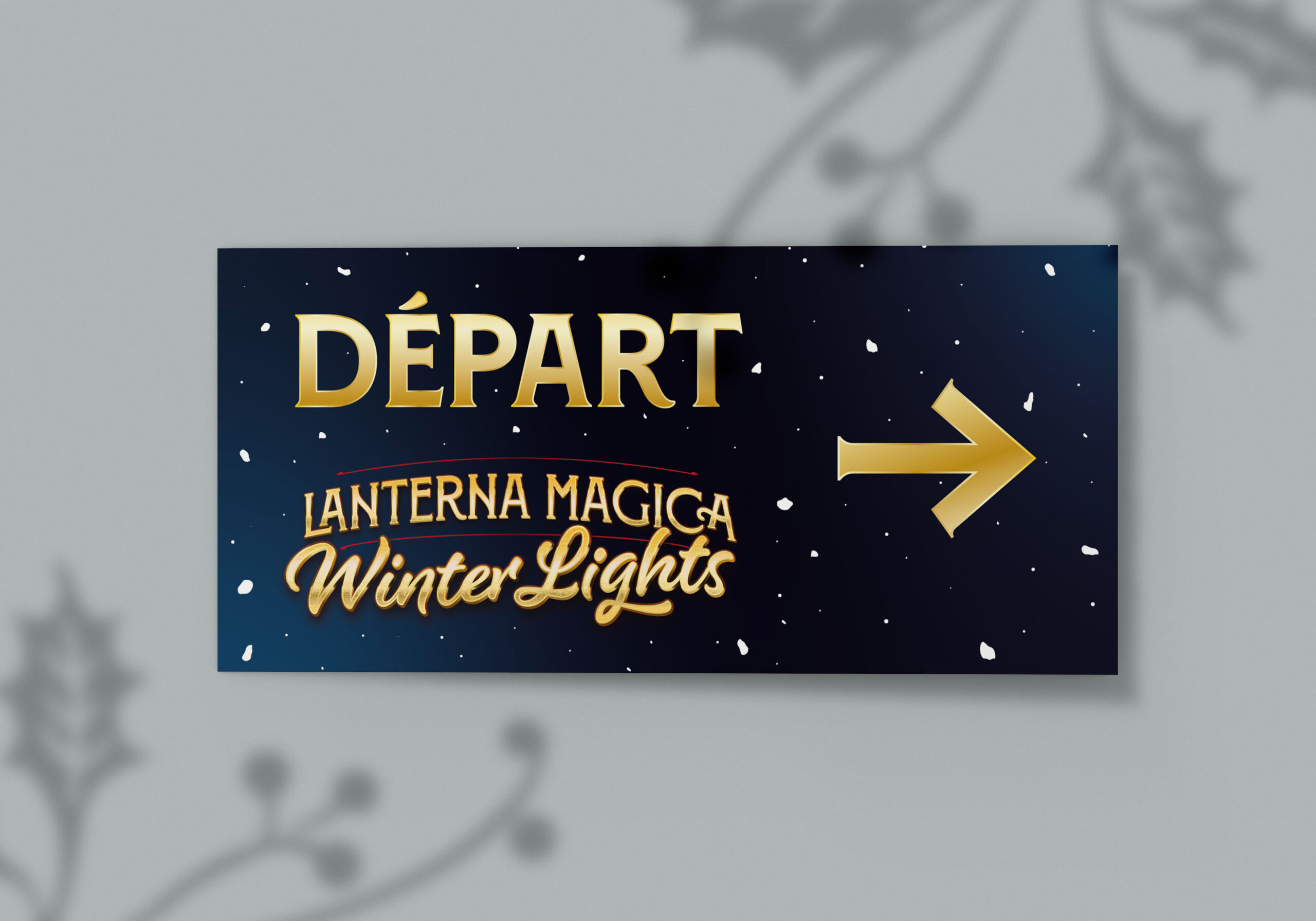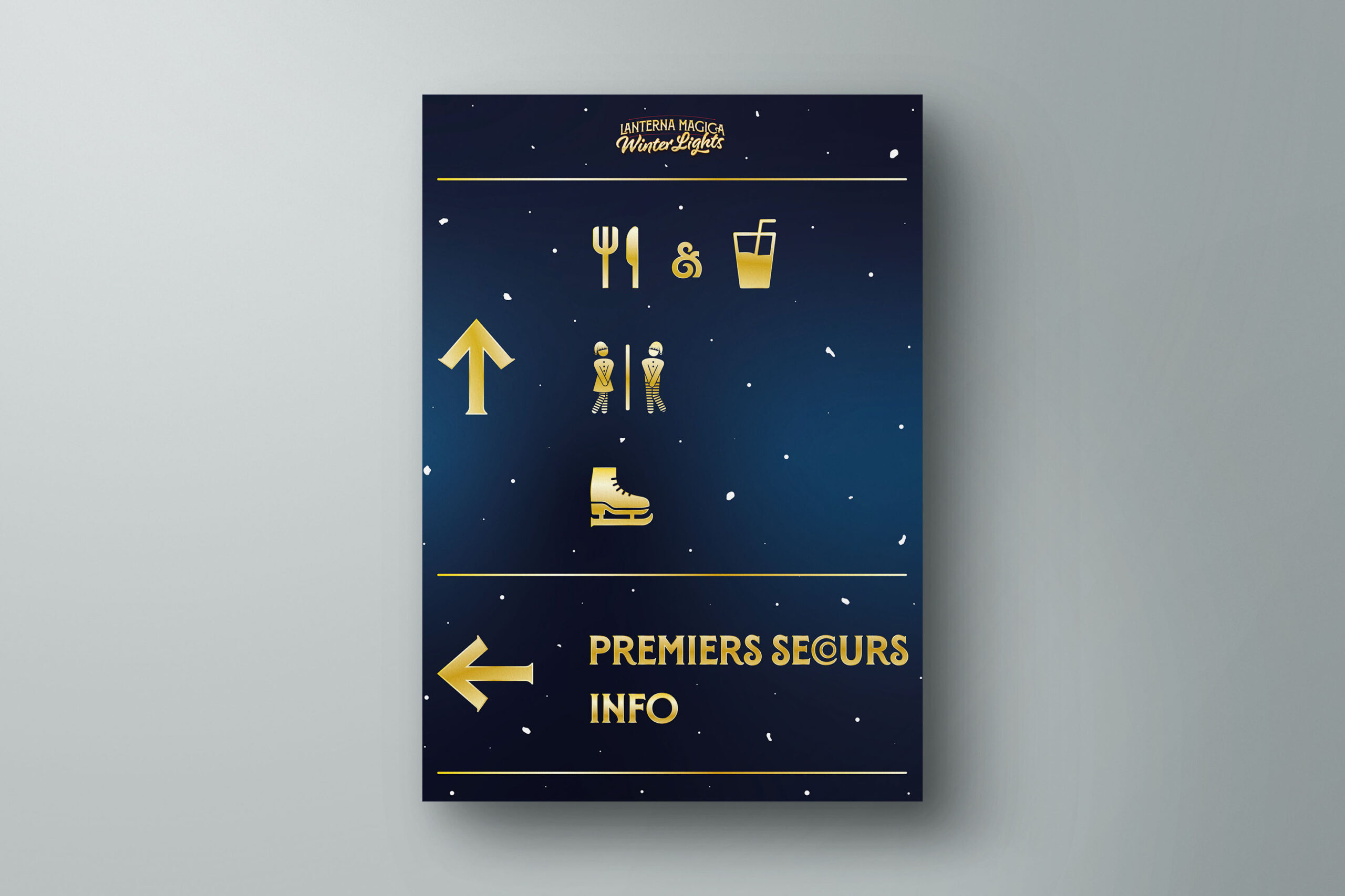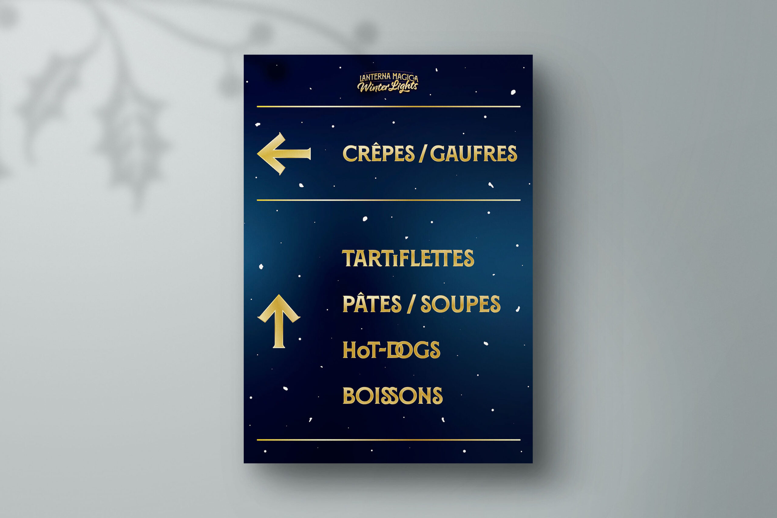 L’édition 2024 avait pour thème « Winter Lights ». L’objectif était de respecter l’identité visuelle tout en l’harmonisant avec l’ambiance hivernale et féerique de l’événement. Pour la signalétique, j’ai élaboré des éléments graphiques permettant une orientation fluide des visiteurs. Les containers ont été personnalisés pour s’intégrer dans le décor.