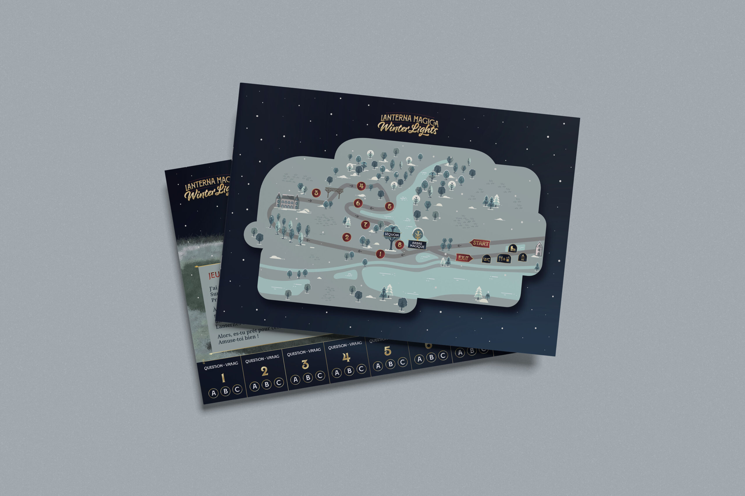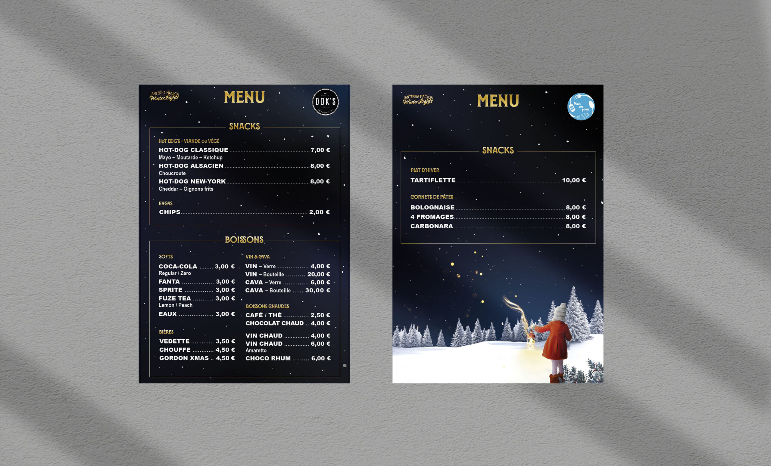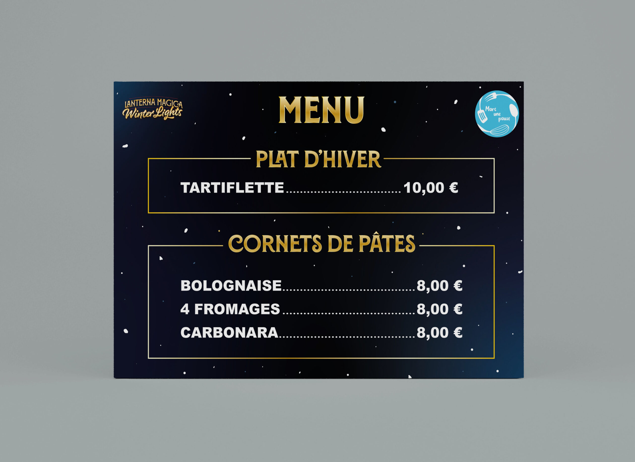 L’édition 2024 avait pour thème « Winter Lights ». L’objectif était de respecter l’identité visuelle tout en l’harmonisant avec l’ambiance hivernale et féerique de l’événement. Pour la signalétique, j’ai élaboré des éléments graphiques permettant une orientation fluide des visiteurs. Les containers ont été personnalisés pour s’intégrer dans le décor.
