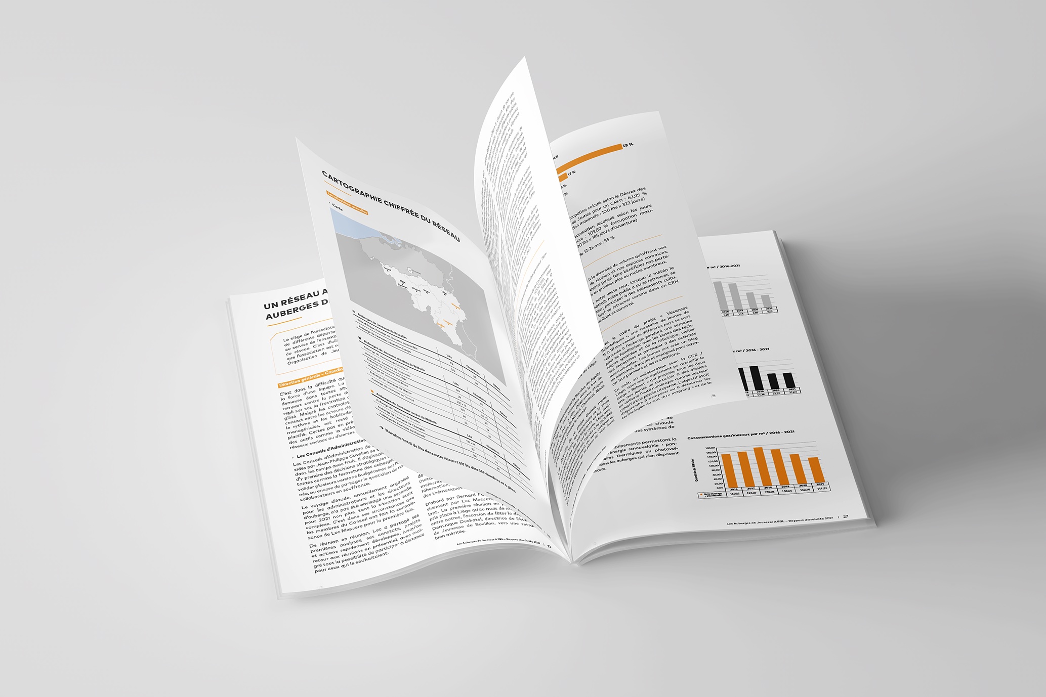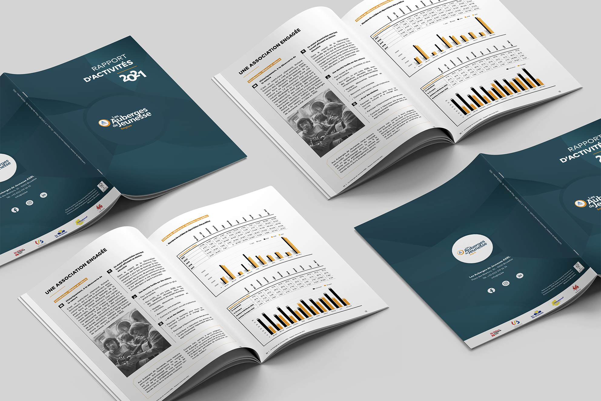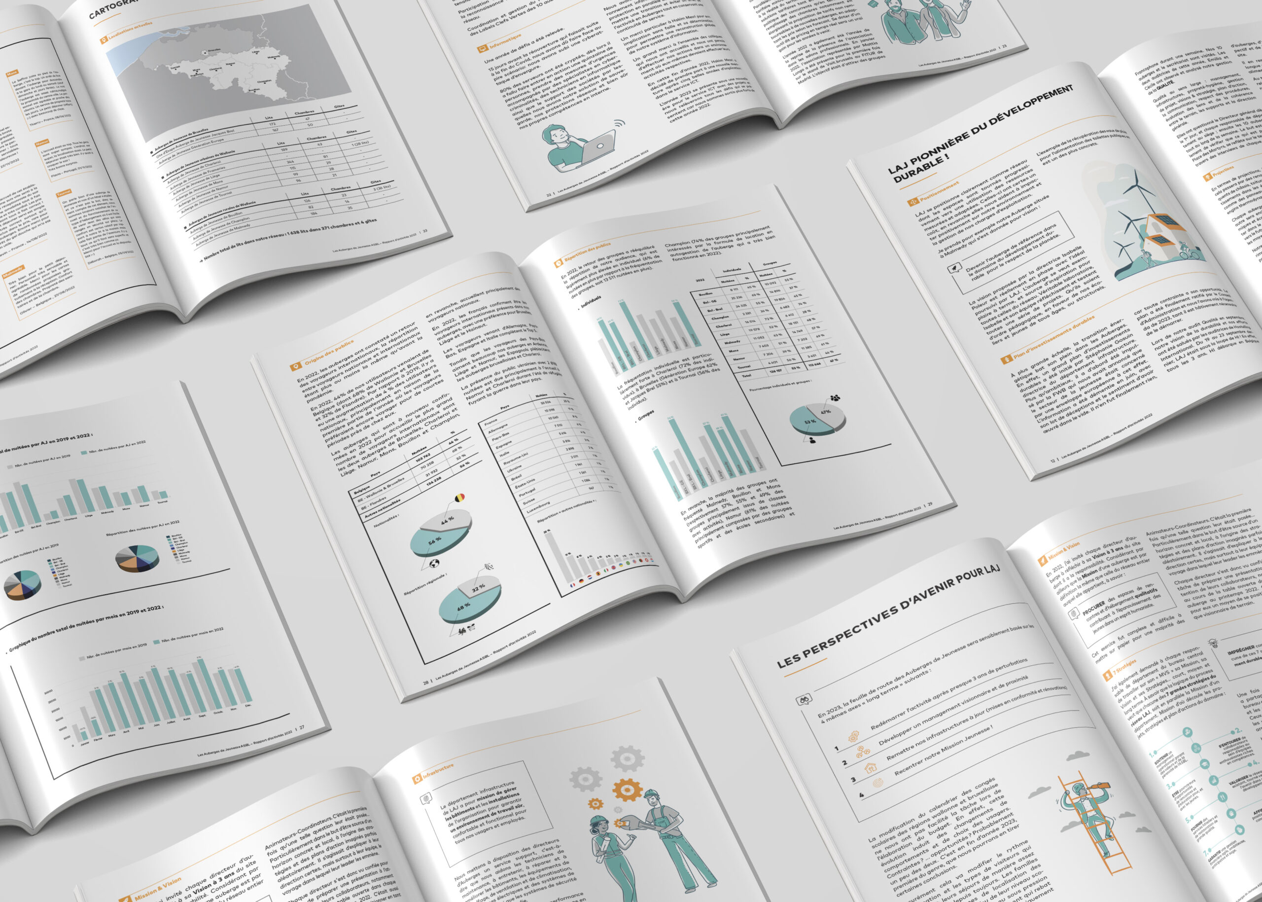 Mise en page des rapports et annexes financières des Auberges de Jeunesse Belgium 2021 et 2022. Brochures de 100 pages au format final fermé A4. Les rapports d’activités comprennent une mise en page respectueuse de la charte graphique de l’ASBL ainsi que la réalisation d’illustrations, tableaux, schémas et diagrammes.